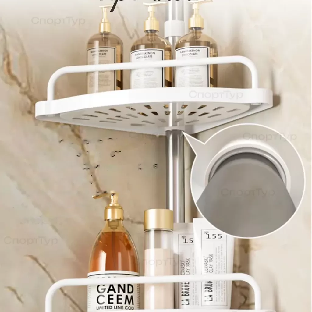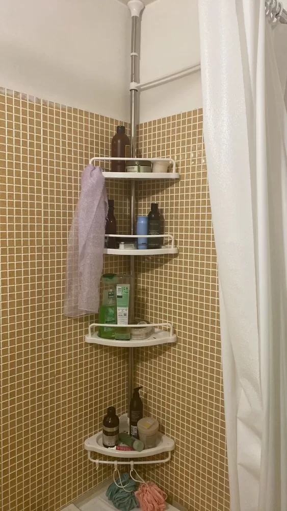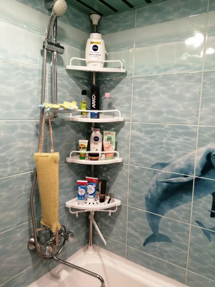 Paigaldage post põranda ja lae vahele ning paigutage kõik oma kohale: šampoonid, geelid, raseerijad, svammid. Riiulid pöörlevad ja on hõlpsasti kõrguse järgi reguleeritavad — mugav isegi väikeses vannitoas.